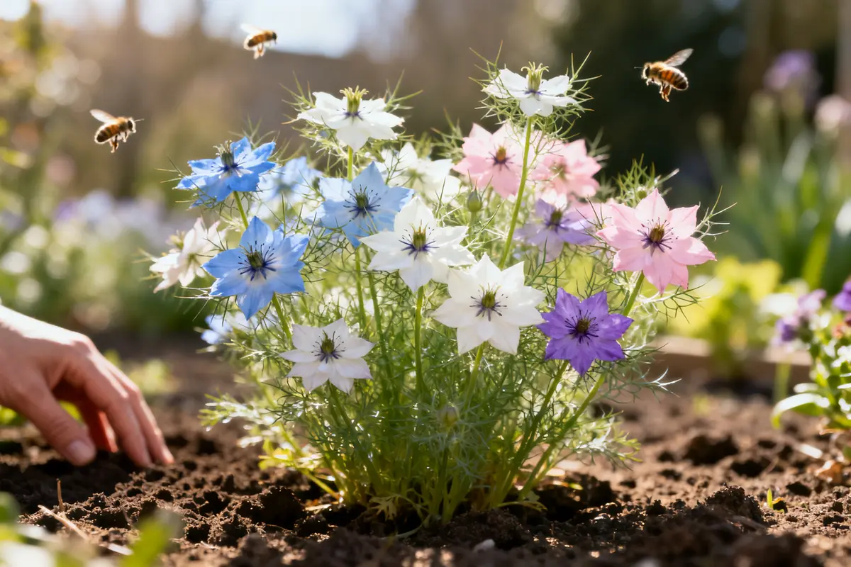 Die Jungfer im Grünen, botanisch Nigella damascena, erlebt seit einigen Jahren ein Comeback. Früher war sie in Bauerngärten weit verbreitet. Heute kehrt sie zurück, weil sie gleich mehrere Vorteile mitbringt. Ihr filigranes Laub wirkt leicht und schwebend. Die sternförmigen Blüten leuchten in Hellblau, Weiß, Rosa und zarten Violetttönen. Dadurch wirkt sie nie schwer oder überladen.