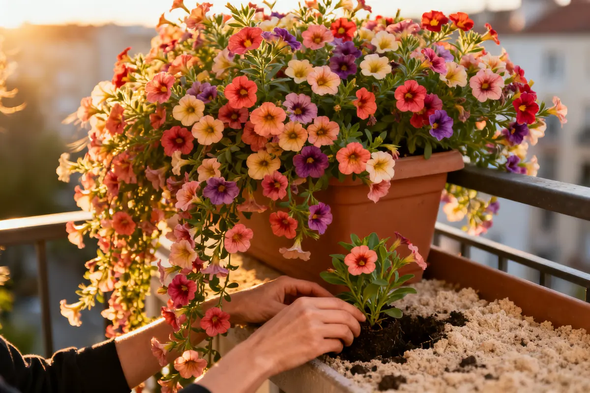 Calibrachoa, oft als Million Bells oder Mini-Petunie angeboten, gehört botanisch zur gleichen Familie wie Petunien. Doch sie wirkt feiner und moderner. Die Pflanzen bilden dichte Kissen von 15 bis 30 Zentimetern Höhe und erreichen eine Breite von bis zu 60 Zentimetern. In Balkonkästen oder Hängeampeln hängen die Triebe wie ein Vorhang über den Rand.